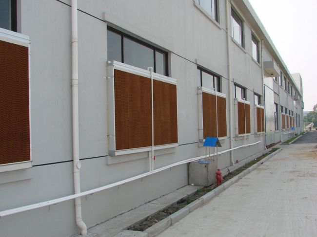 原理:这是一种水蒸发降温系统,当空气通过湿帘时,水蒸发会带走热量,从而降低室内温度。